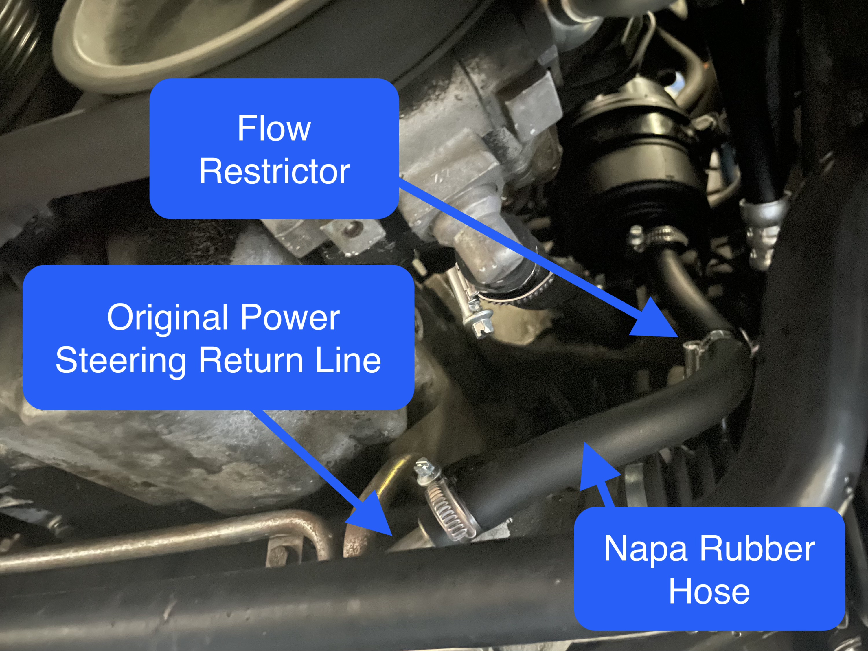 Next, you’ll want to remove the hose clamp in the middle of the hose, and remove the flow restrictor (in my case, the restrictor fell out as soon as I loosened the clamp). Then, cut the hose to 11.5” or 11.75” (I did 11.5”, and thought 11.75” would have been better), place the restrictor somewhere in the middle, and use one of the clamps to hold it in place. Then, it’s just a matter of installing a clamp on the return pipe, and another on the reservoir. I gave mine a bit of a twist to avoid the power steering boot, and I have plenty of hose to try again if it ends up being a problem.